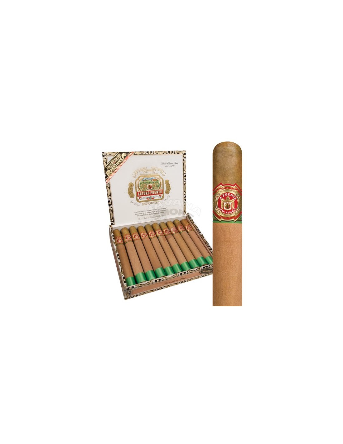Количество сигар в коробке: 20; страна производства: Доминиканская Республика; бренд: Arturo Fuente; размер сигары: 165 мм; диаметр сигары: 19,8 мм; время курения: 55–75 минут; крепость: средняя; начинка: отборный доминиканский табак; связующий лист: доминиканский; покровный лист: Connecticut Shade; формат: Double Corona.