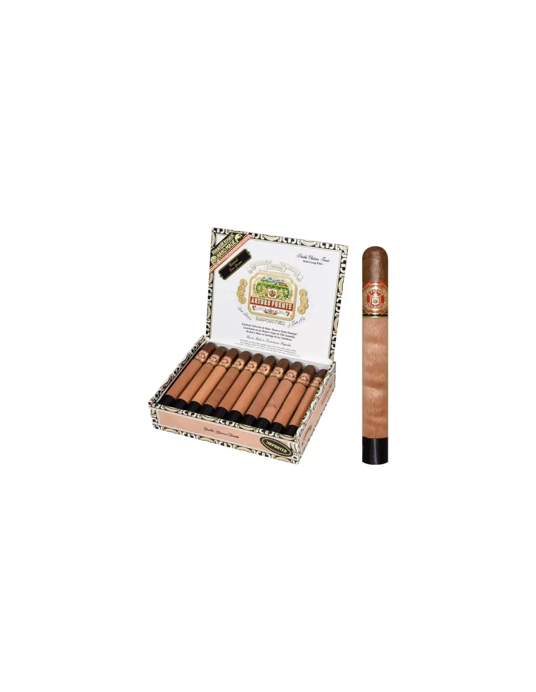 Количество сигар в коробке: 20; страна производства: Доминиканская Республика; бренд: Arturo Fuente; размер сигары: 178 мм; диаметр сигары: 19 мм; ориентировочное время курения: 60–80 минут; крепость: средняя; начинка: отборный доминиканский табак; связующий лист: доминиканский; покровный лист: Sungrown; формат: Double Corona.