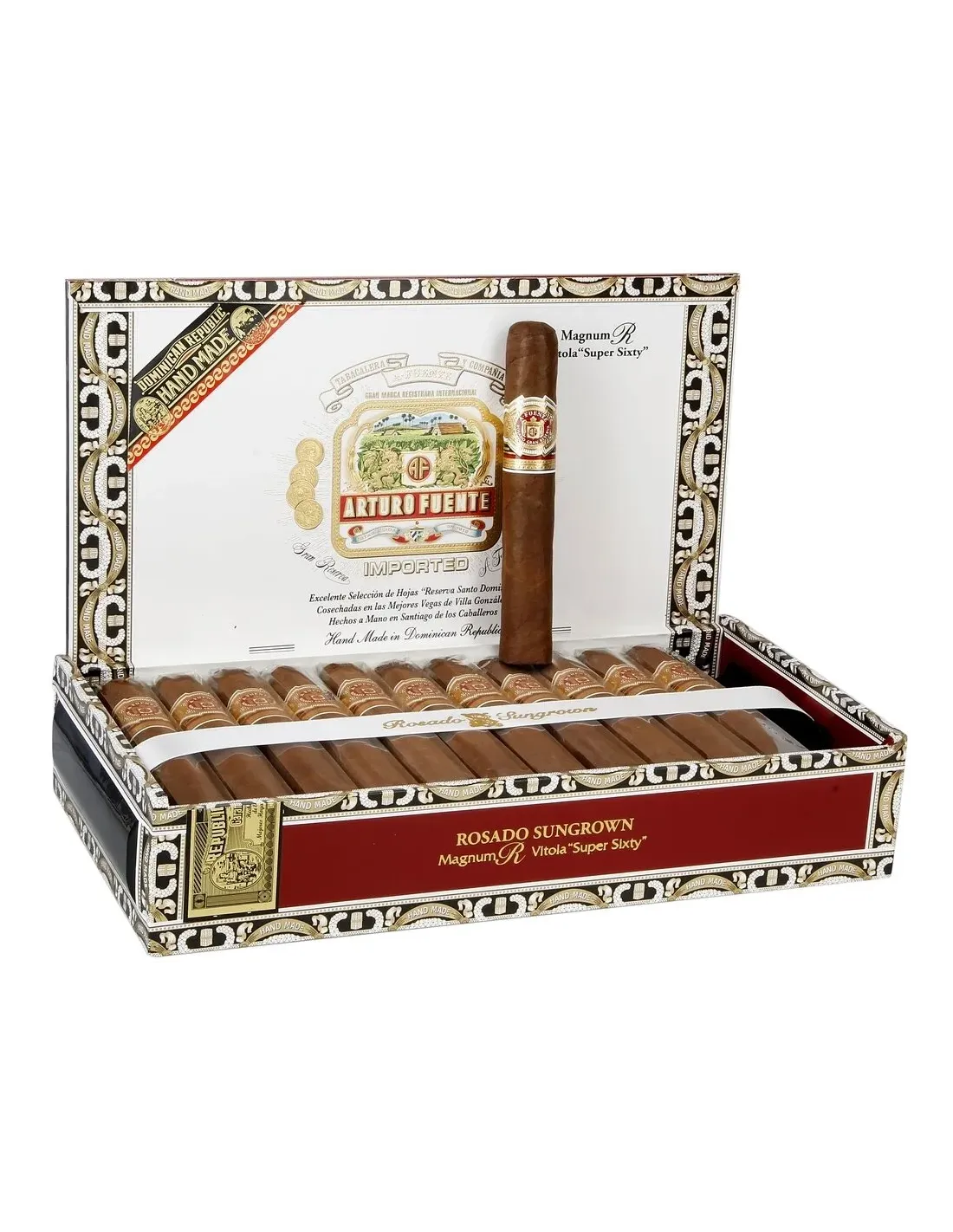Характеристики: количество сигар в коробке — 24; страна производства — Доминиканская Республика; бренд — Arturo Fuente; размер сигары — 152 мм; диаметр сигары — 24 мм; время курения — 60–80 минут; крепость — средняя; начинка — выдержанный доминиканский табак; связующий лист — доминиканский; покровный лист — Rosado Sun Grown; формат — Gordo.