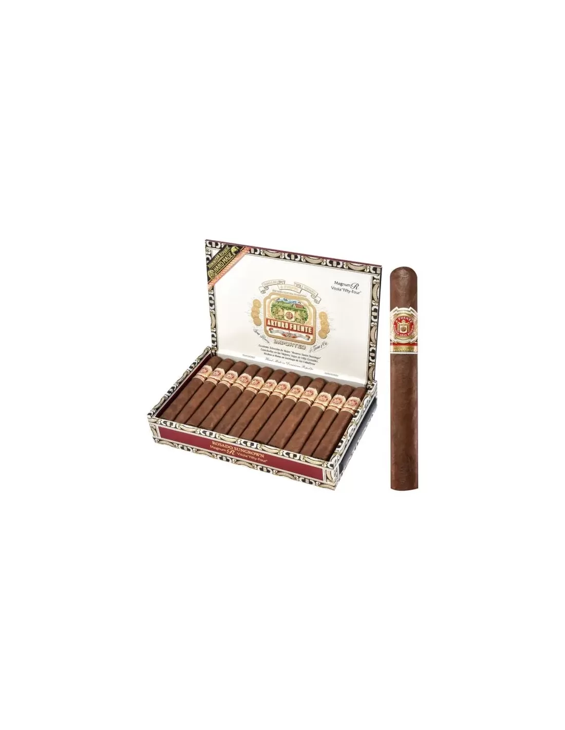 Arturo Fuente Rosado Sun Grown Magnum R54 — это плотная, аккуратно скрученная robusto extra с ровной тягой и стабильным горением. Сигара раскрывается мягкими оттенками сладковатого кедра и сливочного хлебного теста, к которым постепенно добавляются ноты поджаренного миндаля, белого перца и легкая пряность. Во второй трети проявляются нюансы карамели, сухофруктов и немного какао, вкус становится глубже, но не агрессивным. Ближе к финалу крепость усиливается, появляются тона темной древесины, эспрессо и легкая терпкость кожи. Сигара хорошо подойдет для размеренного отдыха вечером, сочетаясь с выдержанным ромом, бурбоном или крепким черным чаем.