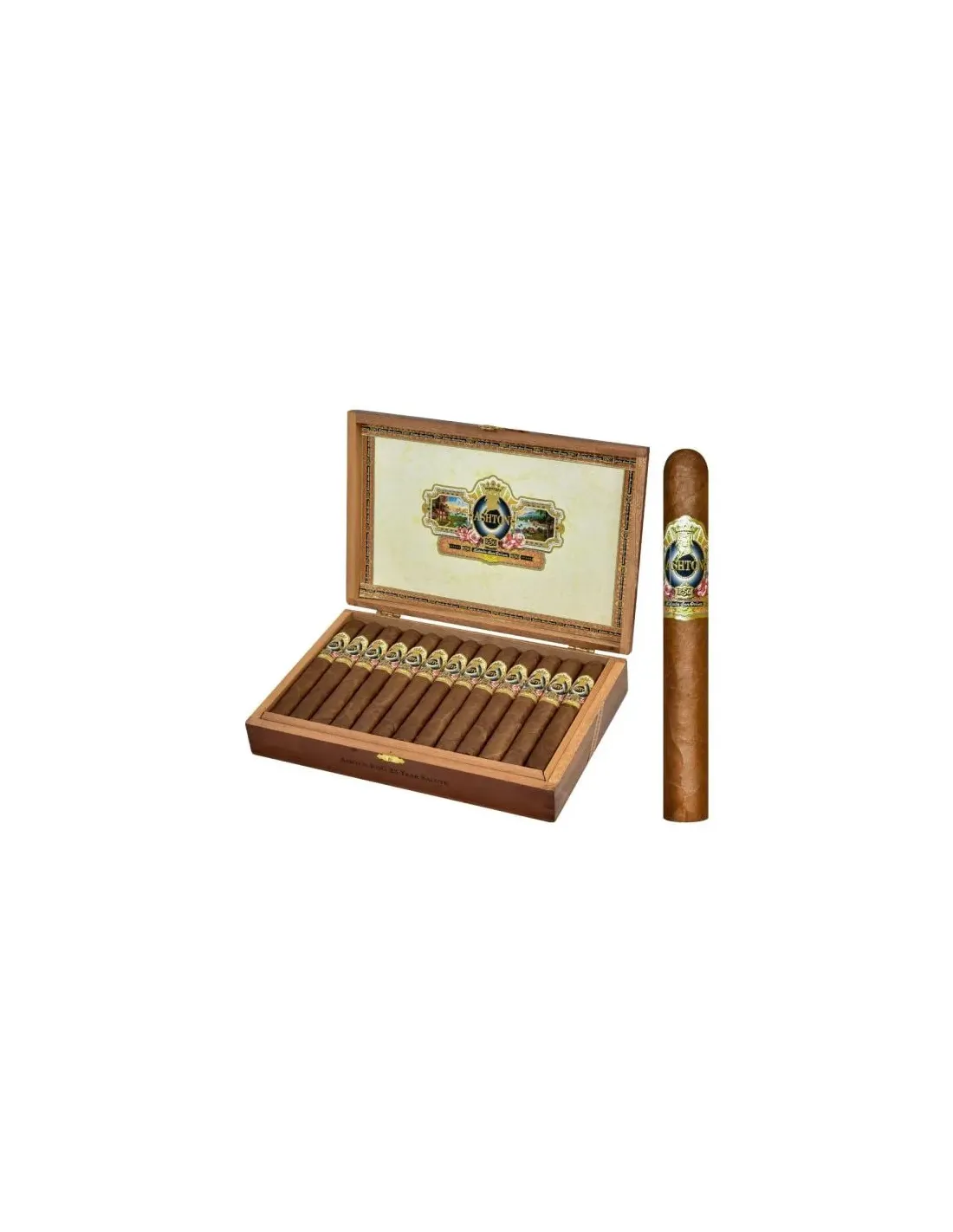 Количество сигар в коробке: 25; страна производства: Доминиканская Республика; бренд: Ashton; размер сигары: 165 мм; диаметр сигары: 20,6 мм; ориентировочное время курения: 60–80 минут; крепость: средняя; начинка: выдержанный доминиканский табак; связующий лист: доминиканский; покровный лист: редкий доминиканский Sun Grown; формат: Churchill.