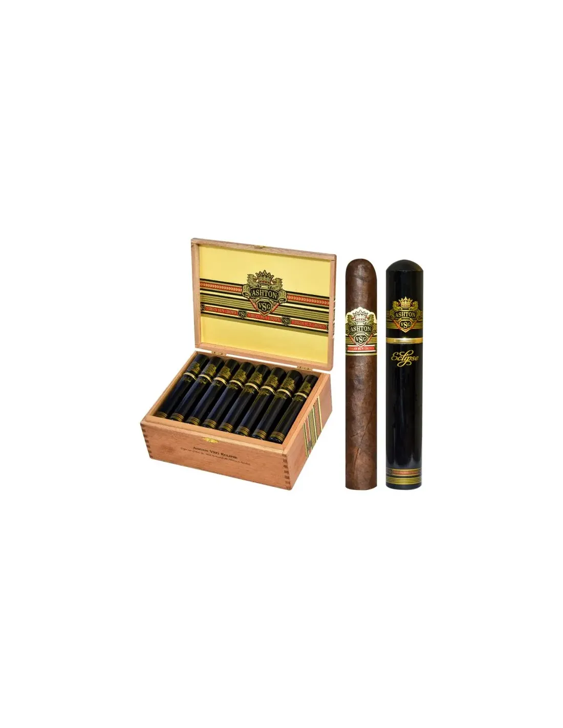 Характеристики Ashton VSG Eclipse Tubos: количество сигар в коробке — 24; страна производства — Доминиканская Республика; бренд — Ashton; размер сигары — 165 мм; диаметр сигары — 21 мм; примерное время курения — 60–80 минут; крепость — выше средней, ближе к крепкой; начинка — выдержанный доминиканский табак; связующий лист — доминиканский; покровный лист — редкий Sun Grown табак из Эквадора; формат — Toro в алюминиевой тубе.