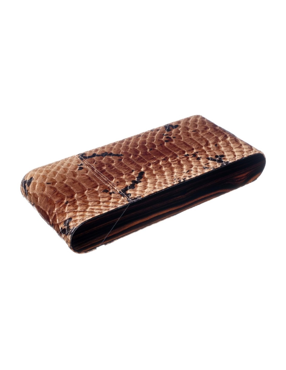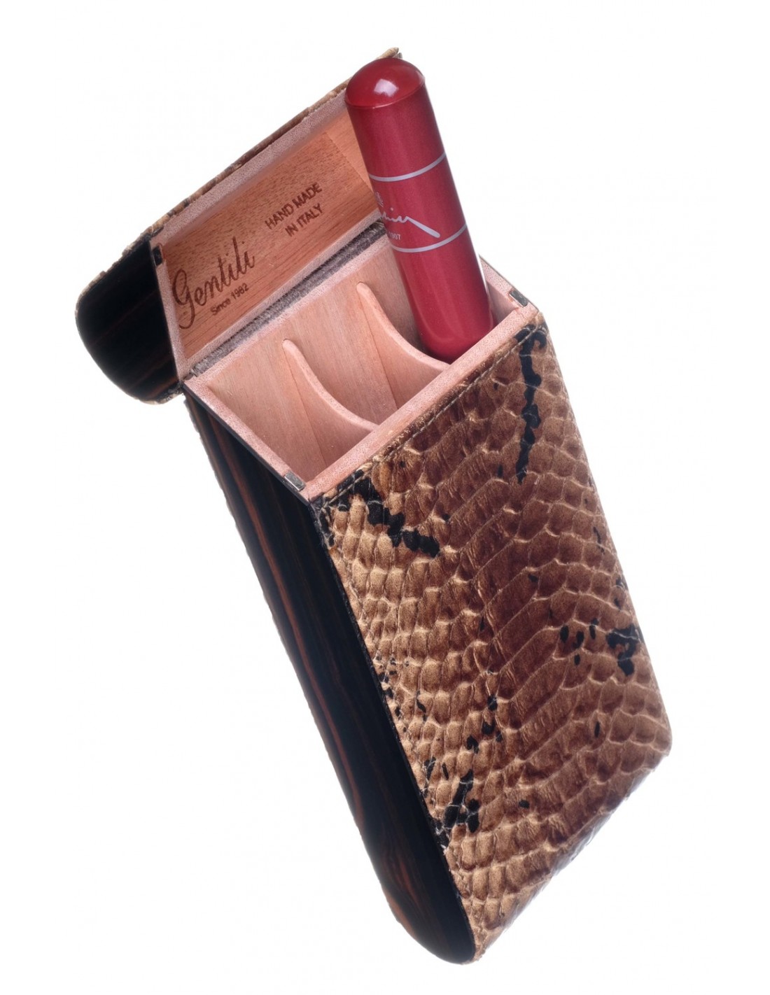 Чехол сигарный от Итальянской компании GENTILI, известной в сигарном мире своими хьюмидорами премиум-класса. Изготовлен из массива Испанского кедра с отделкой шпоном Эбенового дерева и телячей кожей с тиснением «Питон». Вмещает в себя 3 сигары длиной до 16,5 см и диаметром до 2,3 см (ring gage 58) формата Робусто. Подарочная упаковка.