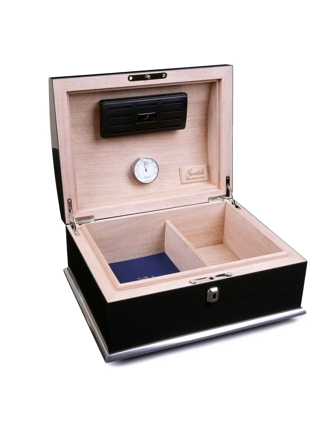 Комплектация включает всё необходимое для полноценного использования: ключ к надёжному замку (обеспечивает безопасность содержимого), фирменный аналоговый гигрометр Gentili — точный прибор для контроля влажности, увлажнитель с акриловым полимером, обеспечивающий стабильный уровень влажности на протяжении длительного времени, оригинальный буклет Gentili на нескольких языках с информацией о бренде и подробной инструкцией по уходу за хьюмидором.