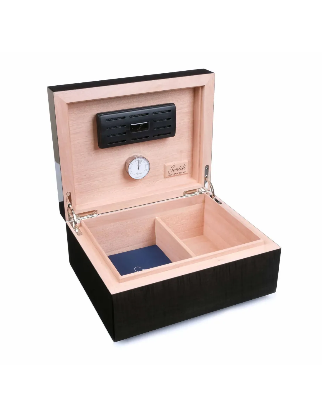 Новый хьюмидор премиум-класса на 50 сигар от итальянских мастеров фабрики Fabrizio Gentili SRL. Модель характеризуется строгим классическим дизайном, подходящим для большинства интерьеров, и безупречностью в исполнении. Корпус представляет собой комбинацию нескольких видов дерева, что обеспечивает стойкость к деформации при колебаниях температуры и влажности, снаружи покрыт шпоном Американского клена. Внутренняя отделка выполнена из испанского кедра. На верхней поверхности хьюмидора вручную выполнен рисунок с финишным покрытием 7-ю слоями рояльного лака. В комплекте увлажнитель с акриловым полимером, итальянский гигрометр, фирменный буклет Gentili с информацией о компании и мультиязычной инструкцией по уходу. Подарочная упаковка. Ручная работа, сделано в Италии.