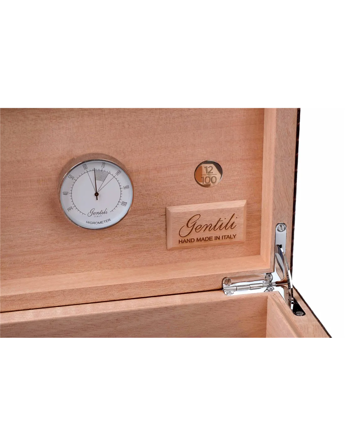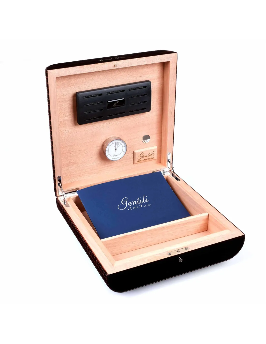 Хьюмидор на 25 сигар лимитированной серии из 100 штук от итальянских мастеров фабрики Fabrizio Gentili SRL. Исполнен в классическом итальянском стиле — элегантное сочетание лучших материалов в единое целое: ценных пород дерева, кожи, металла. Корпус представляет собой комбинацию нескольких видов дерева, что обеспечивает стойкость к деформации при колебаниях температуры и влажности. Внутренняя отделка выполнена из испанского кедра. Снаружи — шпон Эбенового дерева из Индонезии, покрытый 7-ю слоями лака, а также натуральная телячья кожа с тиснением и лакировкой. На внутренней стороне крышки — табличка с порядковым номером изделия в серии из 100 шт. В комплекте увлажнитель с акриловым полимером, итальянский гигрометр, фирменный буклет Gentili с информацией о компании и мультиязычной инструкцией по уходу. Подарочная упаковка. Ручная работа, сделано в Италии.