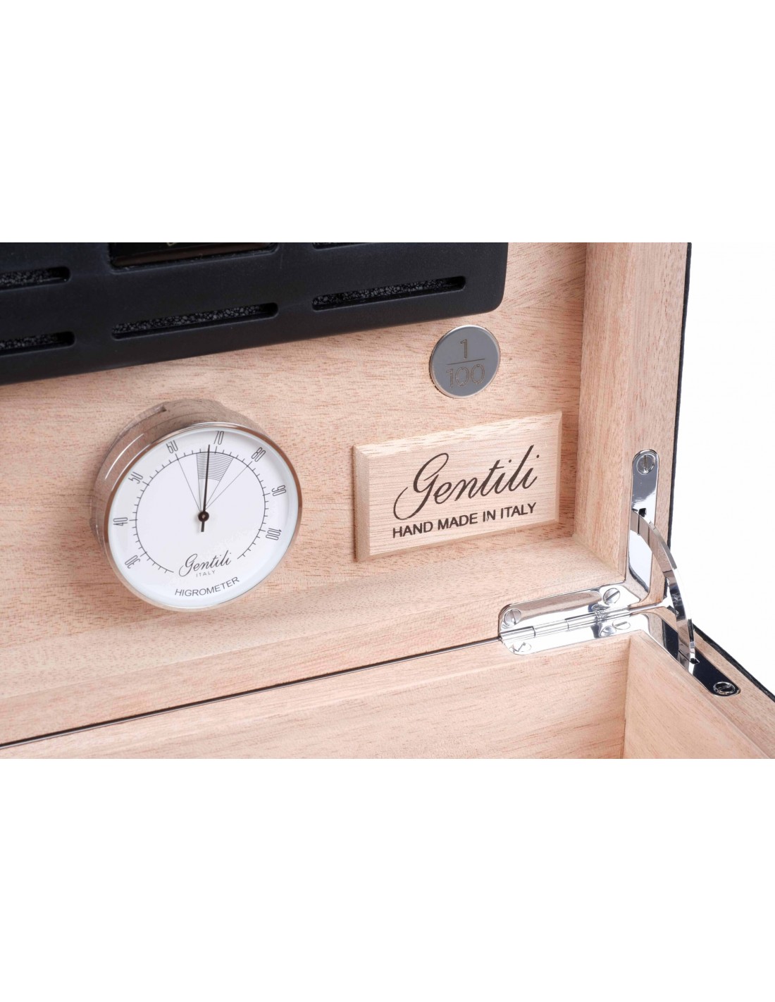 Хьюмидор на 15 сигар лимитированной серии из 100 штук от итальянских мастеров фабрики Fabrizio Gentili SRL. Исполнен в классическом итальянском стиле — элегантное сочетание лучших материалов в единое целое: ценных пород дерева, кожи, металла. Корпус представляет собой комбинацию нескольких видов дерева, что обеспечивает стойкость к деформации при колебаниях температуры и влажности. Внутренняя отделка выполнена из испанского кедра. Снаружи шпон Эбенового дерева из Индонезии, покрытый 7-ю слоями лака, а также натуральная телячья кожа с тиснением и лакировкой. На внутренней стороне крышки — табличка с порядковым номером изделия в серии из 100 шт. В комплекте увлажнитель с акриловым полимером, итальянский гигрометр, фирменный буклет Gentili с информацией о компании и мультиязычной инструкцией по уходу. Подарочная упаковка.