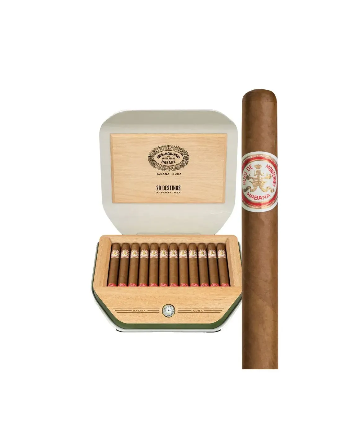 Сигары Hoyo de Monterrey Le Hoyo Destinos представлены в классической коробке на 20 штук. Ключевые характеристики этой витолы: количество в упаковке — 20 сигар; страна производства — Куба; бренд — Hoyo de Monterrey; формат — Edmundo Grueso; размер сигары — 135 мм в длину; диаметр — 22.23 мм; приблизительное время курения — 70-80 минут; крепость — от легкой к средней. Начинка, связующий лист и покровный лист полностью состоят из отборного кубинского табака.