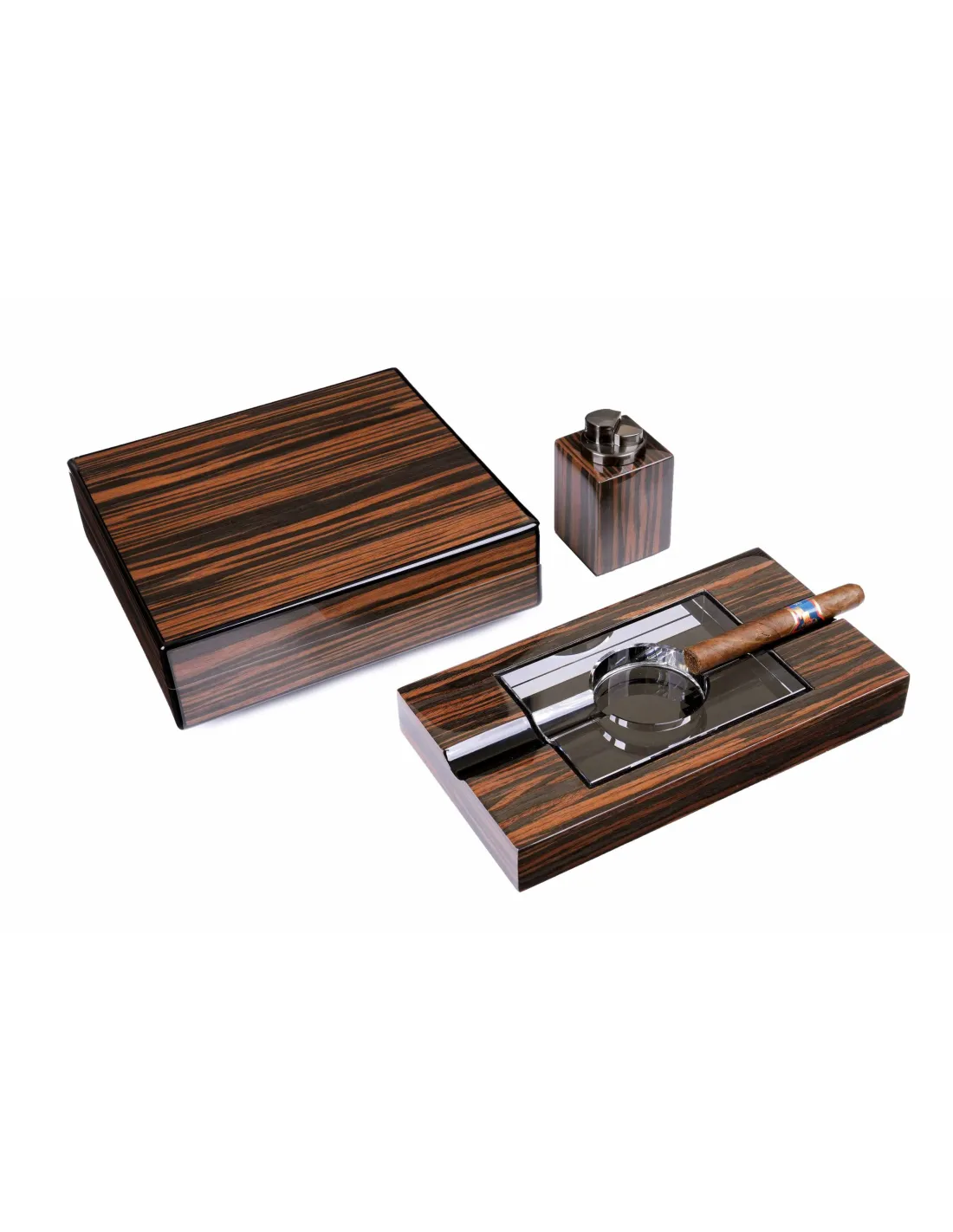 Набор сигарных аксессуаров от итальянской компании Lubinski, состоящий из трех предметов: хьюмидора для хранения сигар, элегантной пепельницы и зажигалки. Идеальный подарок для любого ценителя сигар.