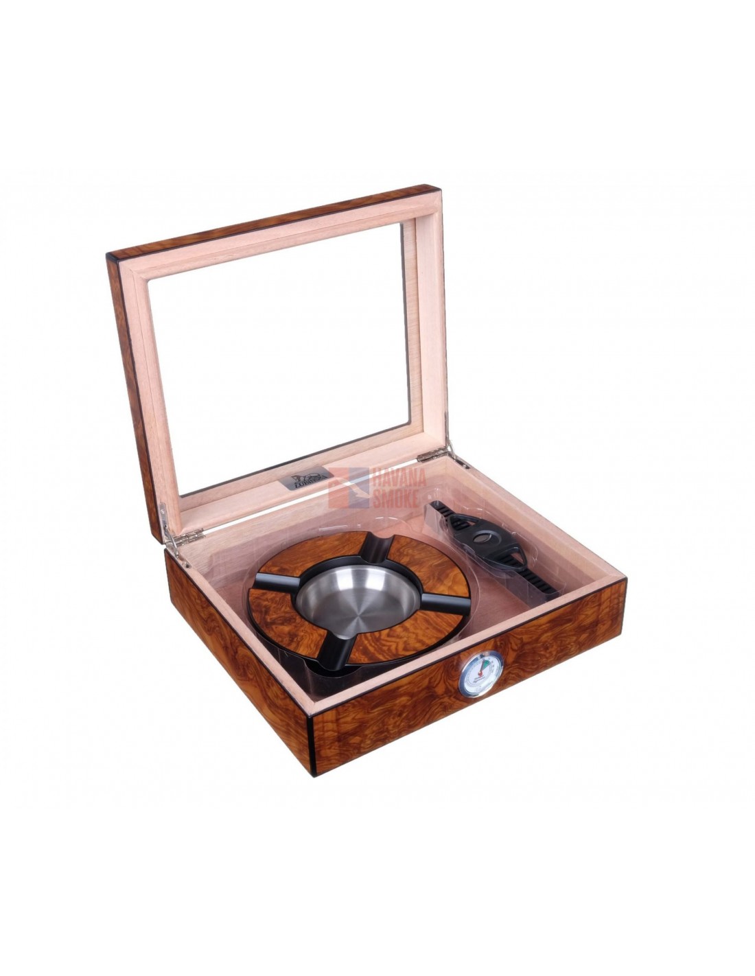 Хьюмидор на 25 сигар в наборе с пепельницей и гильотиной от итальянской компании Lubinski. Внутренняя отделка выполнена из испанского кедра, в комплекте увлажнитель с акриловым полимером, гигрометр, инструкция по уходу. Подарочная коробка. В качестве набора идеально сочетается с настольной сигарной зажигалкой с аналогичной отделкой. Производитель оставляет за собой право без предварительного уведомления вносить незначительные изменения в конструкцию или комплектацию изделия с целью улучшения его свойств.