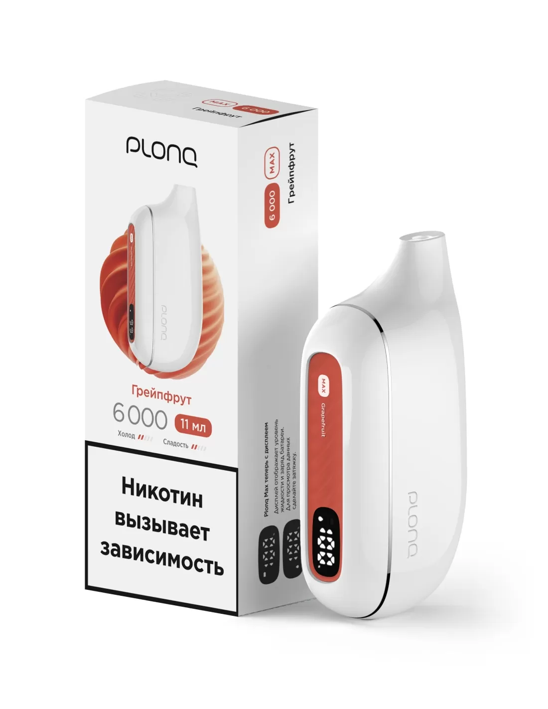 Электронная сигарета Plonq Max Грейпфрут — 6000 затяжек, вкус: сочный грейпфрут, аккумулятор: повышенной ёмкости для длительного использования без подзарядки.