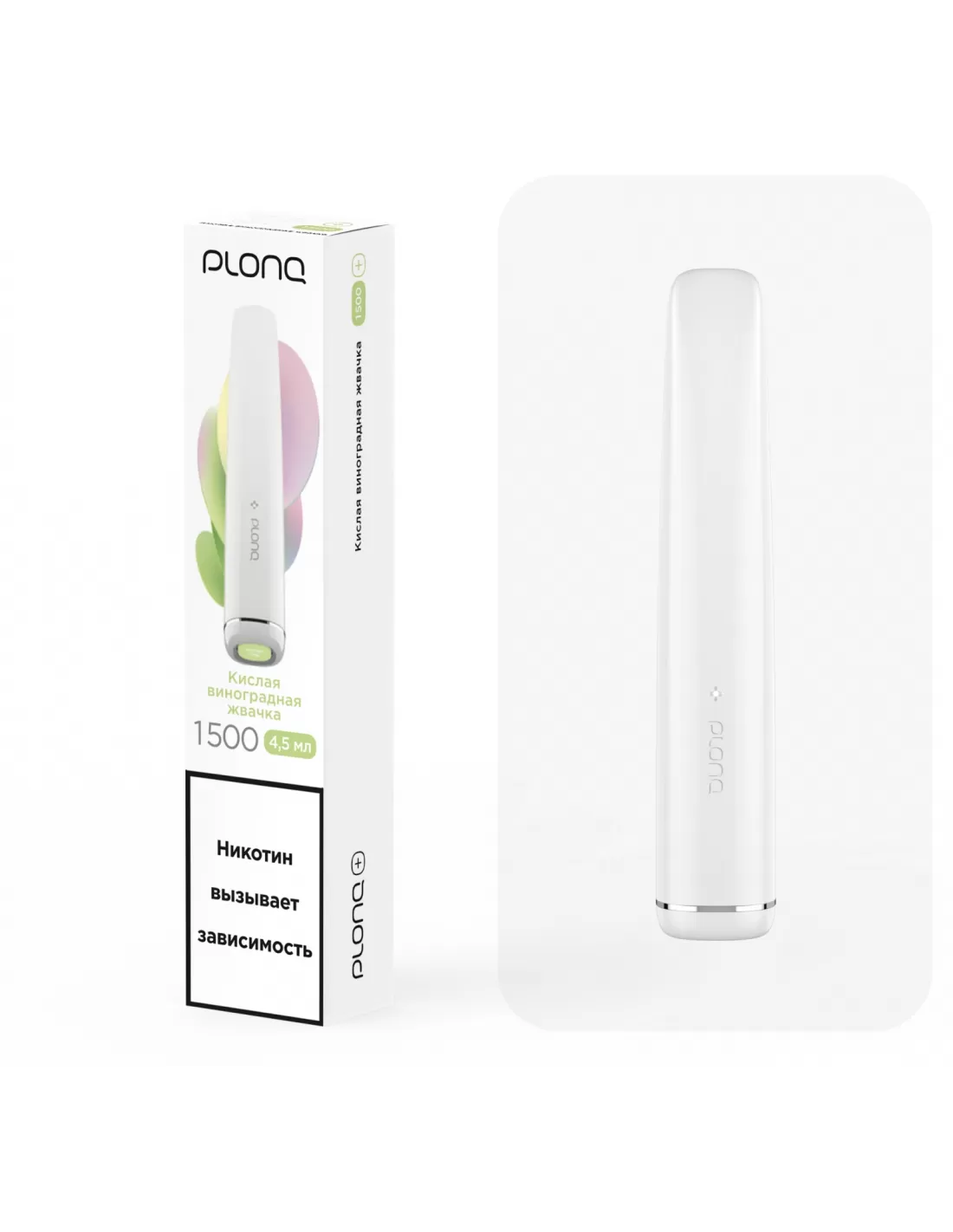 Электронная сигарета Plonq Plus Кислая Виноградная жвачка, 1500 затяжек: количество затяжек — до 1500, вкус — кислая виноградная жвачка, аккумулятор — 550 мАч.