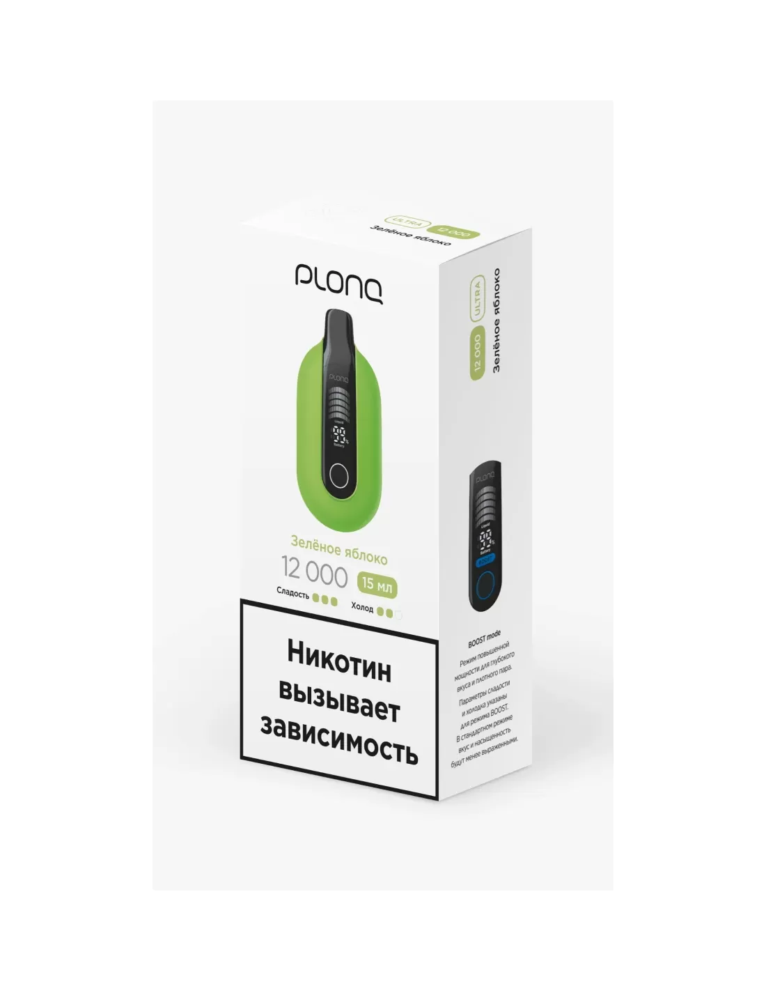 Электронная сигарета Plonq Ultra Зелёное яблоко, 12 000 затяжек — это компактный одноразовый девайс с ресурсом примерно 12 000 затяжек, ярким вкусом зелёного яблока и ёмким встроенным аккумулятором (мощность батареи рассчитана на полный срок службы устройства).