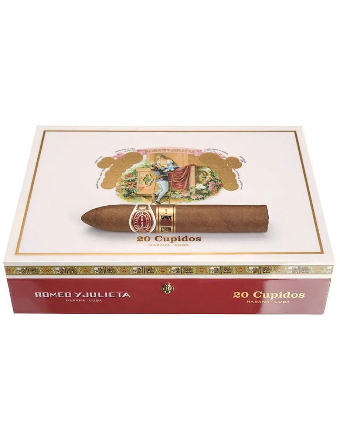 В этой презентабельной коробке находятся 20 сигар Romeo y Julieta Cupidos, полностью созданных вручную на Кубе. Каждая сигара обладает внушительными характеристиками: бренд — Romeo y Julieta; страна производства — Куба; длина — 148 мм; диаметр — 21,83 мм; формат — Veronas. Начинка, связующий и покровный лист изготовлены из отборного кубинского табака. Крепость сигары определяется как средняя, ближе к крепкой, а предполагаемое время курения составляет от 90 до 110 минут.