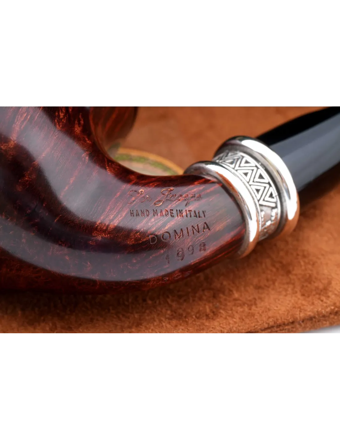 Трубка Года SER JACOPO DOMINA 1998 в шкатулке S344-2 — коллекционная модель, созданная итальянскими мастерами с особым вниманием к форме и деталям. Корпус аккуратно выточен из выдержанного бриара, за счет чего трубка смотрится благородно и солидно, а рисунок древесины выглядит выразительно и живо.