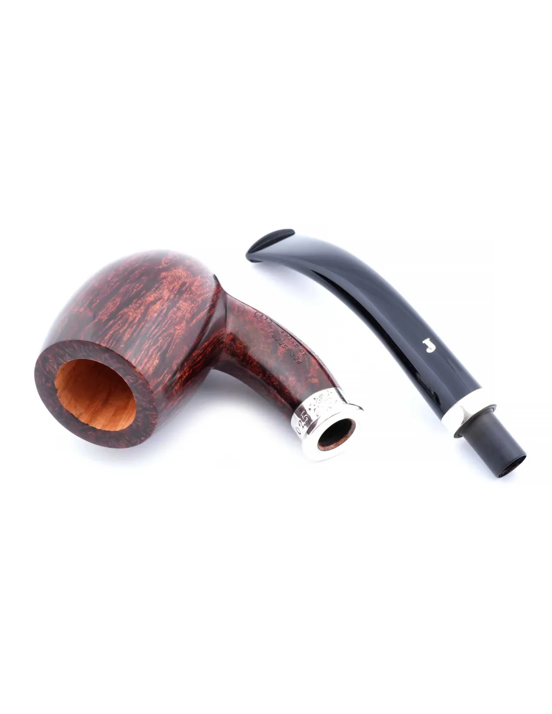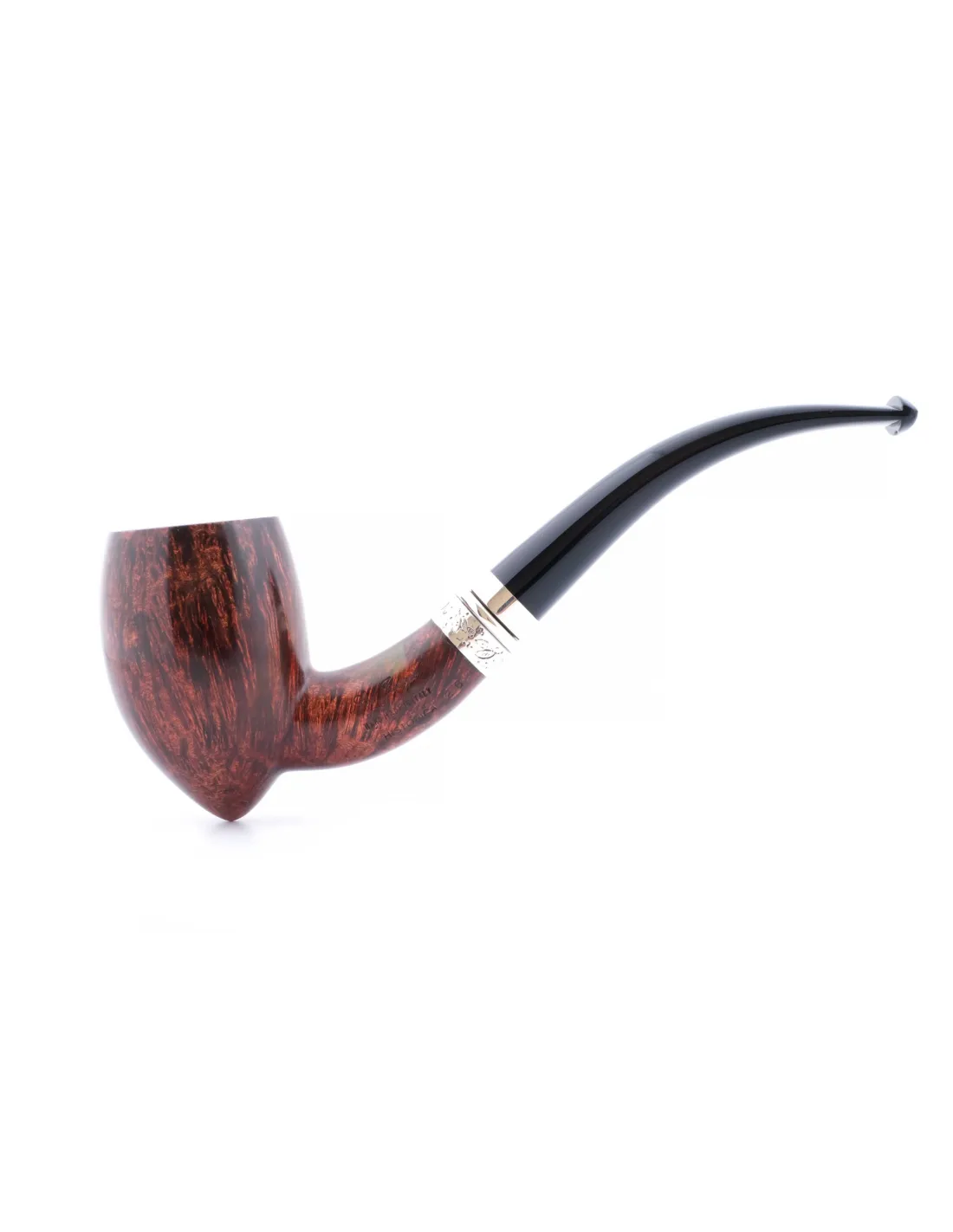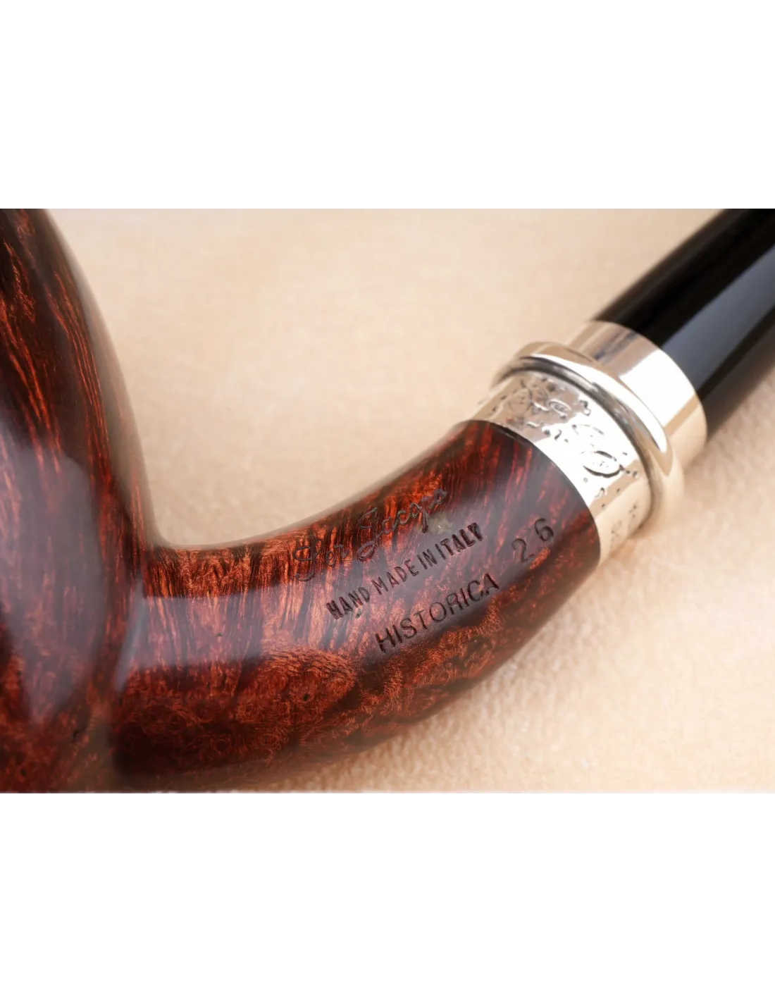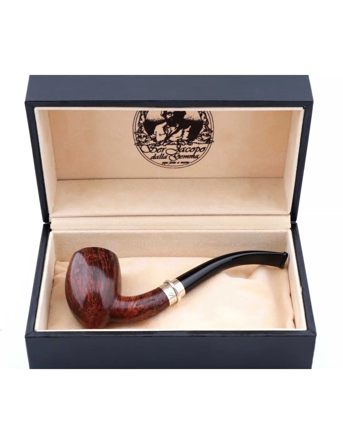 Трубка SER JACOPO Historica 2025 года в шкатулке S115-1 — изысканная ручная работа итальянских мастеров, созданная из отборного бриара. Корпус аккуратно отполирован, рисунок древесины хорошо читается, мундштук плавно продолжает форму чаши, благодаря чему трубка смотрится гармонично и дорого.