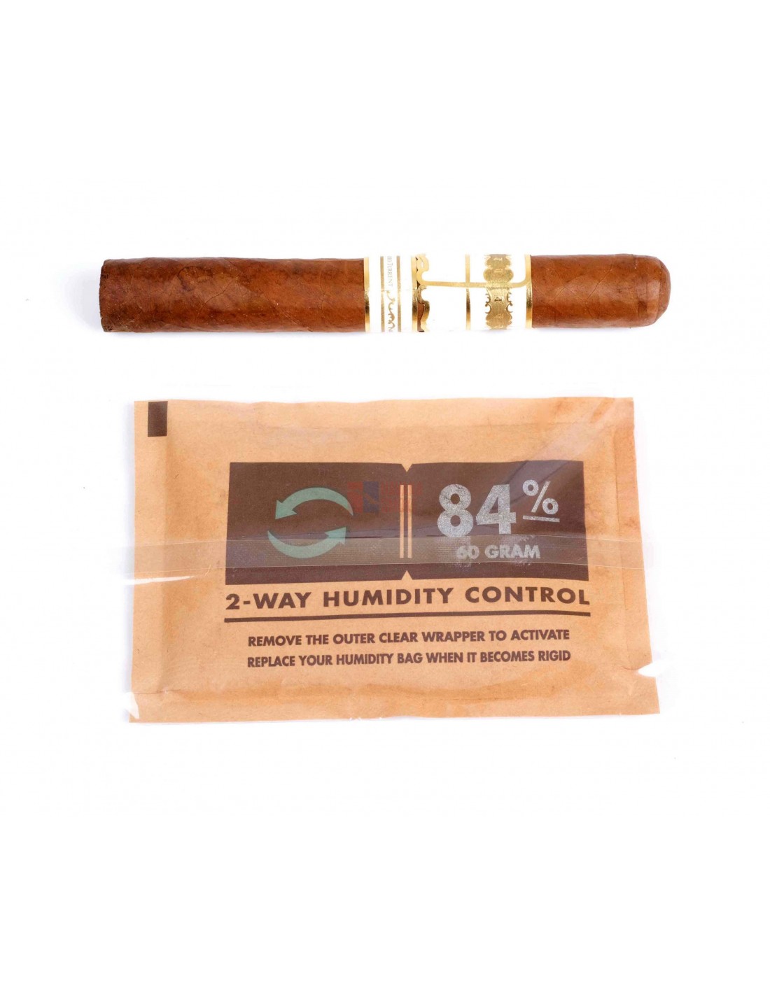 Увлажнитель для сигар с водно-солевым раствором в оболочке с осмос-мембраной. Один 8-грамовый пакетик рассчитан на хранение до 5 сигар в течение 2 месяцев при расчетной влажности 72%.