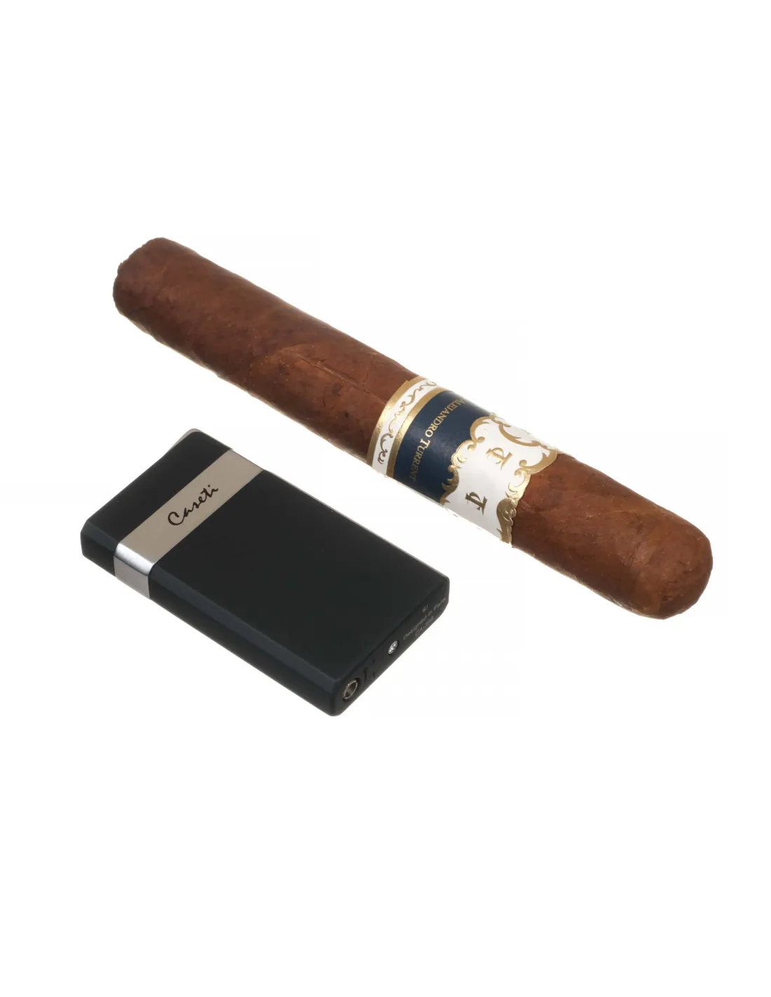 Сигарная турбо-зажигалка французского бренда Caseti. Идеально подходит для розжига сигар благодаря мощному турбо-пламени. В корпус встроена гильотина диаметром 20 мм. Размер 70x35x16 мм. Фирменная подарочная коробка, чехольчик для хранения и буклет от компании Caseti.