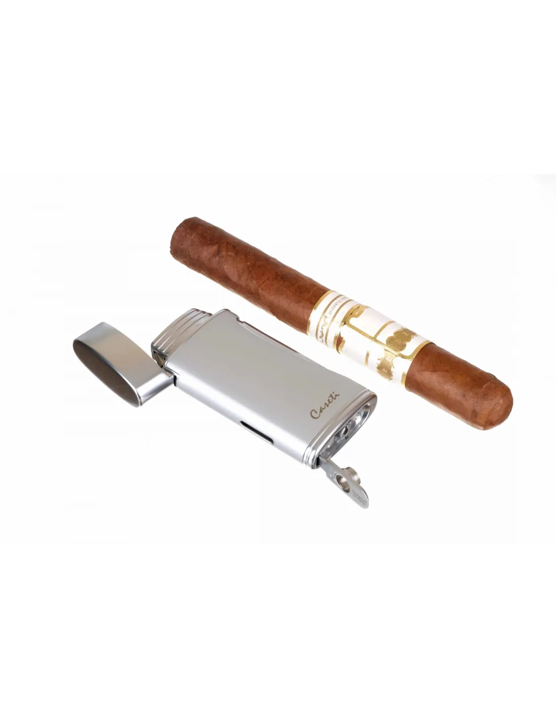 Новая сигарная турбо-зажигалка Caseti с двумя форсунками. Идеально подходит для розжига сигар благодаря мощному двойному турбо-пламени. В корпус встроен пробойник диаметром 8 мм. Размер 85x40x16 мм. Фирменная подарочная коробка, чехольчик для хранения и буклет от компании Caseti.