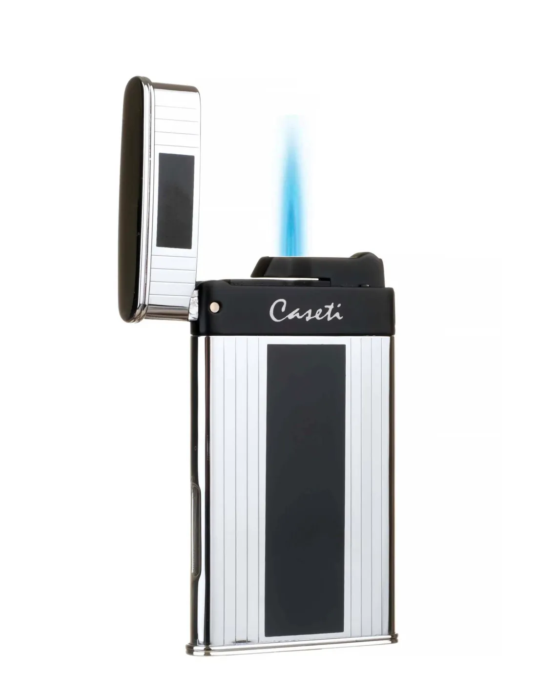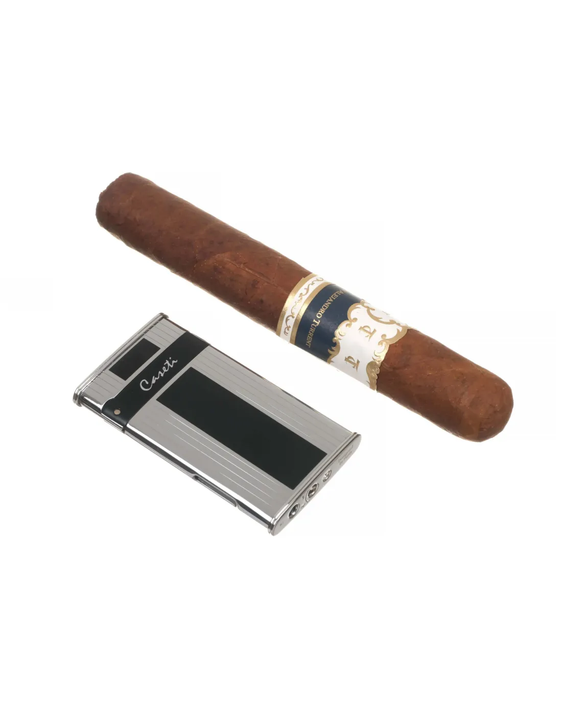 Сигарная турбо-зажигалка французского бренда Caseti. Металлический корпус с отделкой из карбона. Идеально подходит для розжига сигар благодаря мощному двойному турбо-пламени. Размер 3,7х1,3х7 см. Фирменная подарочная коробка, чехольчик для хранения и буклет от компании Caseti.